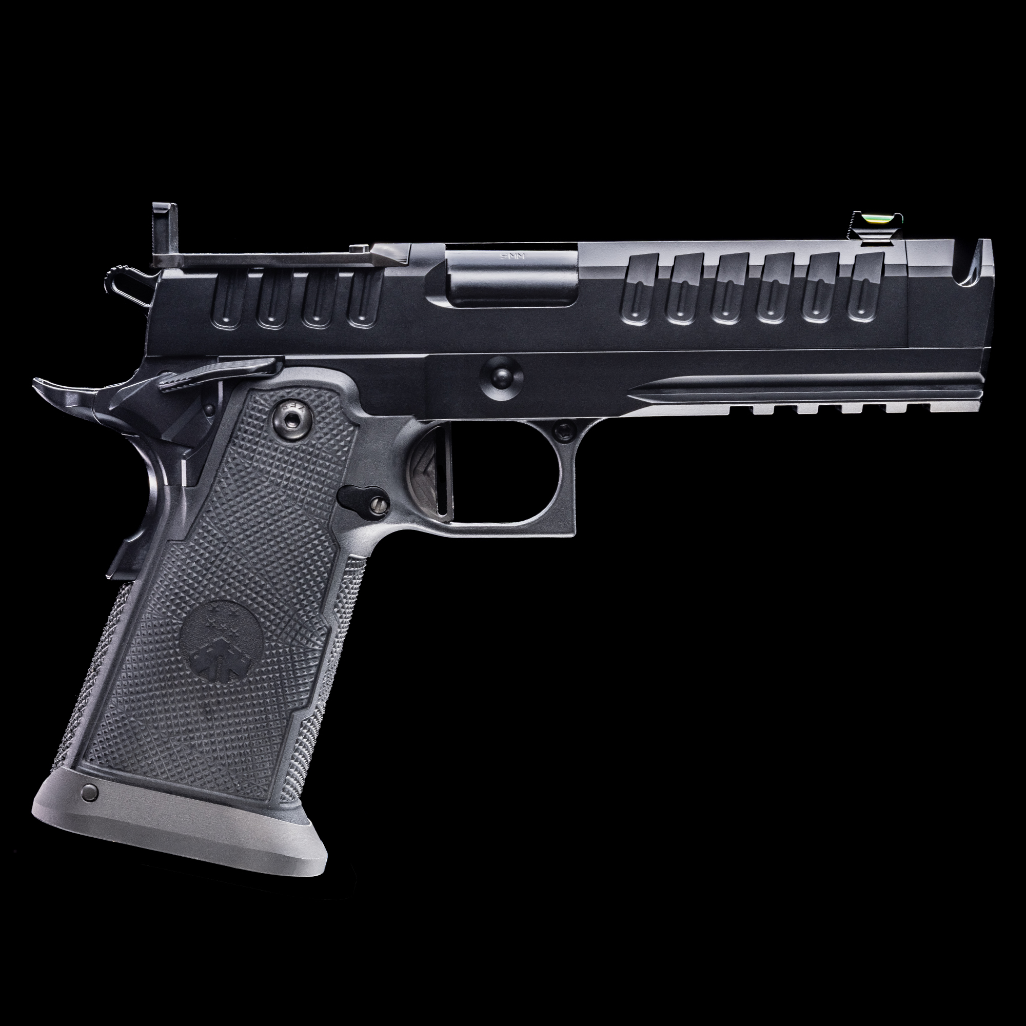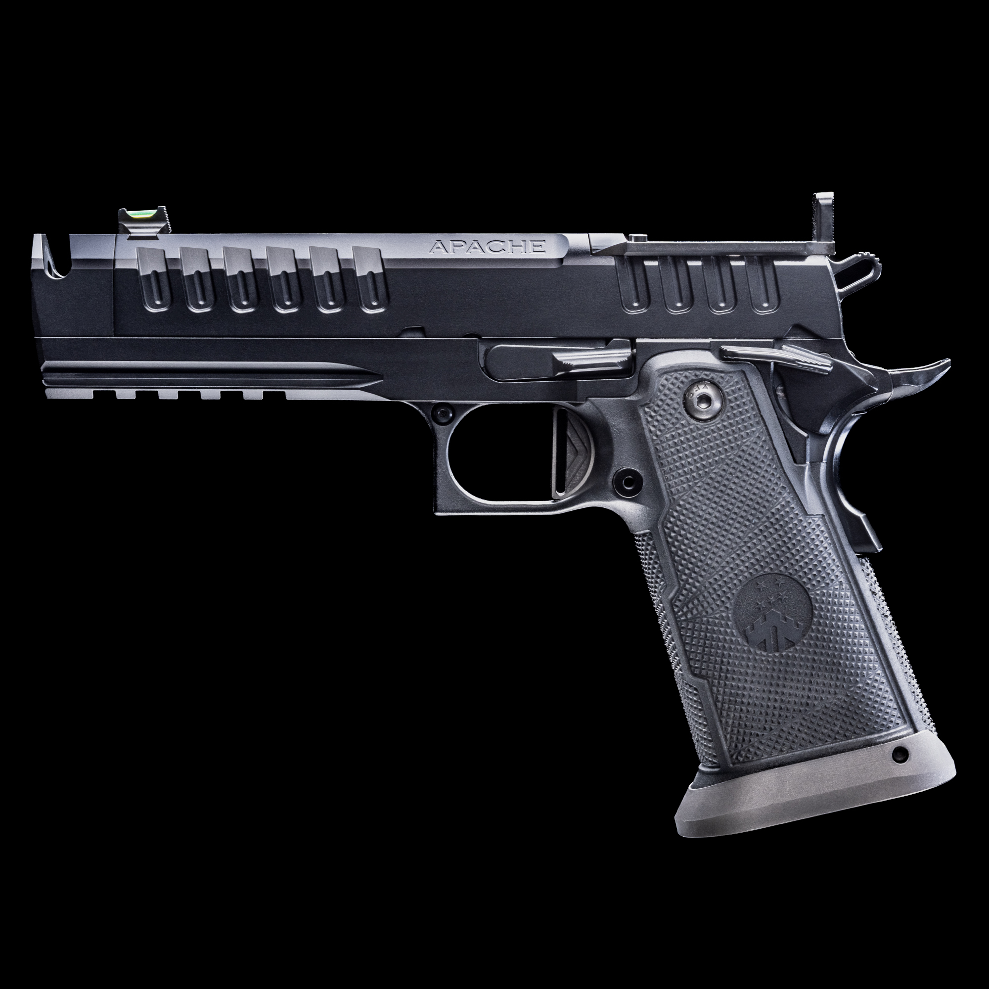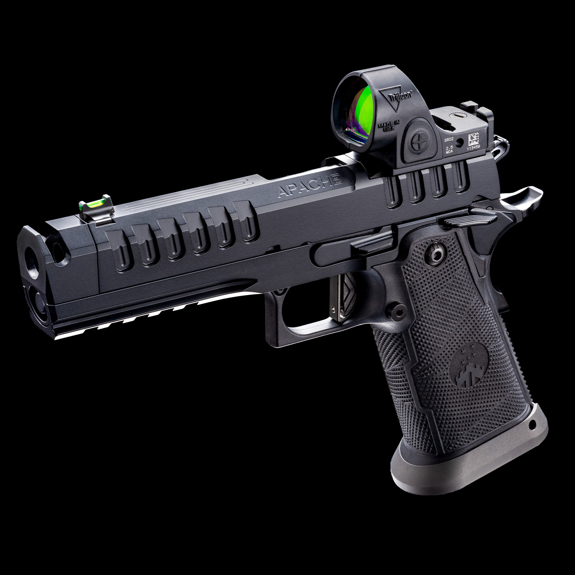 The APACHE MKII is WATCHTOWER’s flagship American-made, all-stainless double-stack 1911—renowned for exceptional recoil control. This compensated, full-size Government-profile handgun is precision-machined, hand-fitted, and fortified by WATCHTOWER’s industry-leading black Graphene coating for unmatched durability. Built for the modern shooter, the APACHE MKII features a tactical grip, extended flared magwell, a refined and remarkably crisp trigger, and ambidextrous safety controls. Delivering a premium, duty-grade platform tailored for high-performance accuracy and control.